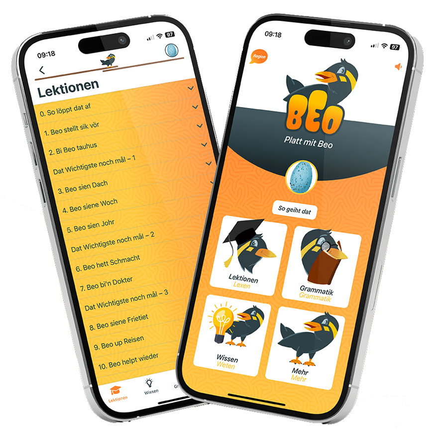 Dat gifft väle Lüd, de giern Plattdüütsch lihren willen, åwer gor nich weiten, wo un woans sei dat anfangen sallen. För all de gifft dat siet dat Enn’ von’n Novembermånd 2024 de App »Plattdeutsch mit Beo«. Woso »mit Beo«? Beos sünd plietsche Vågels, de fi x sünd in’t Språkenlihren. Dat gifft also kum ’n bäder Maskottchen, dat mit de Nutzers dörch de teihn Lekschonen von de App gåhn kann.